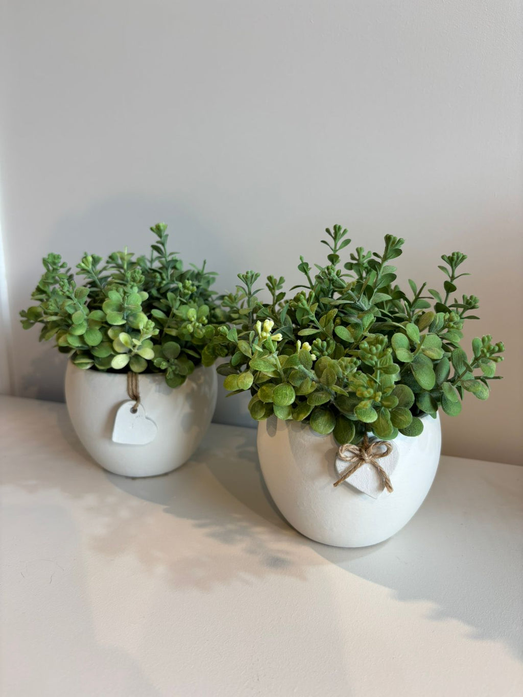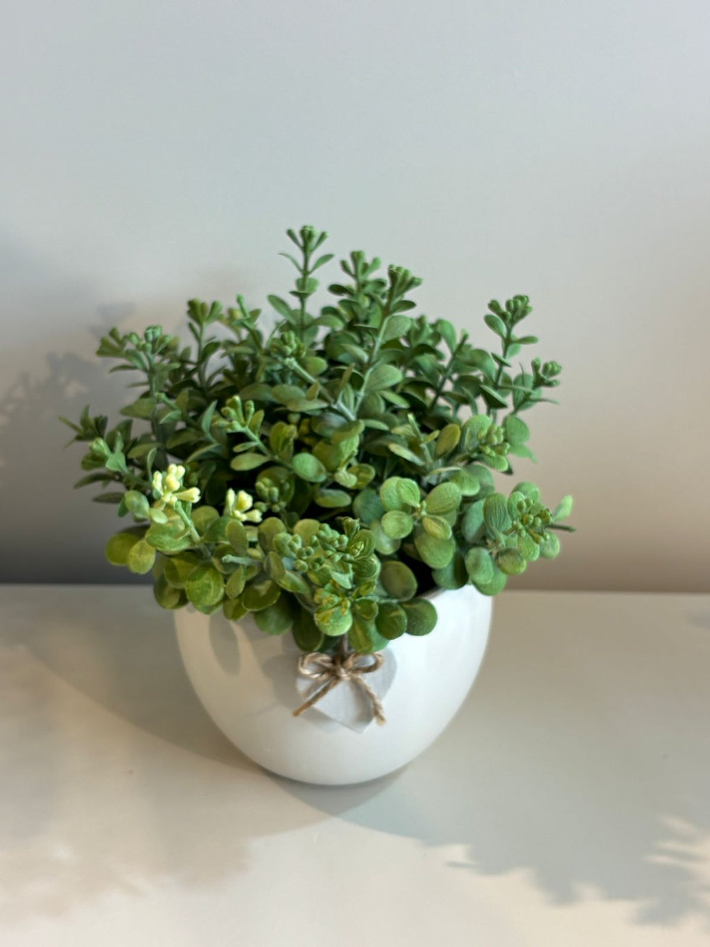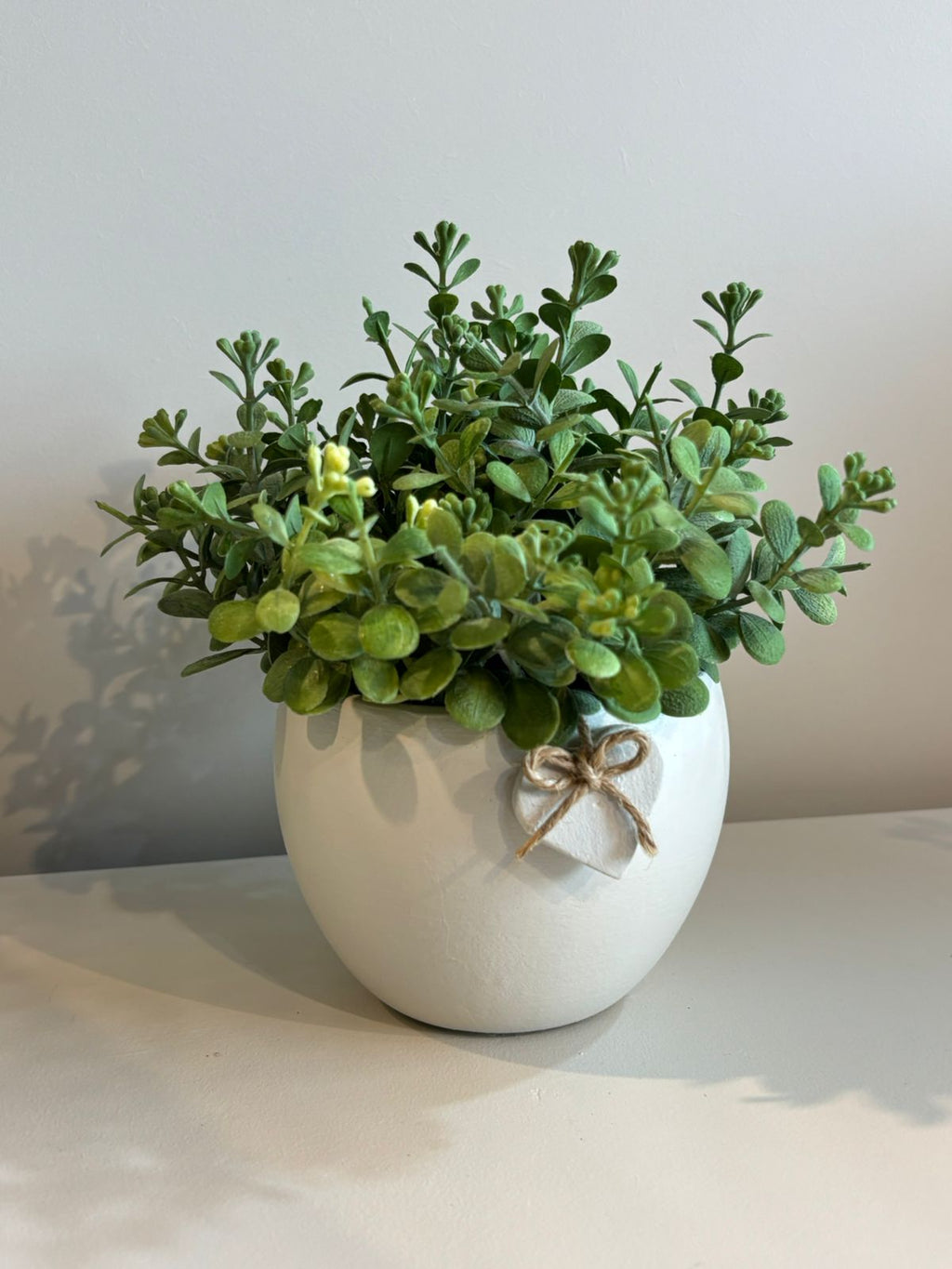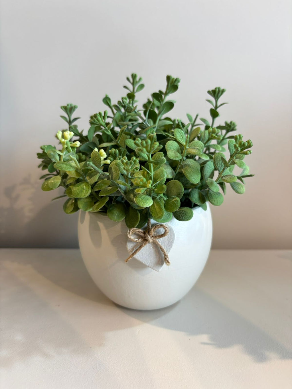 Vaso de cerâmica em branco off white com acabamento liso e elegante. Complementado por um delicado coração cerâmico na mesma tonalidade, este peça combina sofisticação e romantismo. Acompanha arranjo permanente com eucaliptos verdes, oferecendo uma solução decorativa duradoura que mantém sua beleza sem necessidade de manutenção. Ideal para ambientes que buscam um toque natural e refinado.