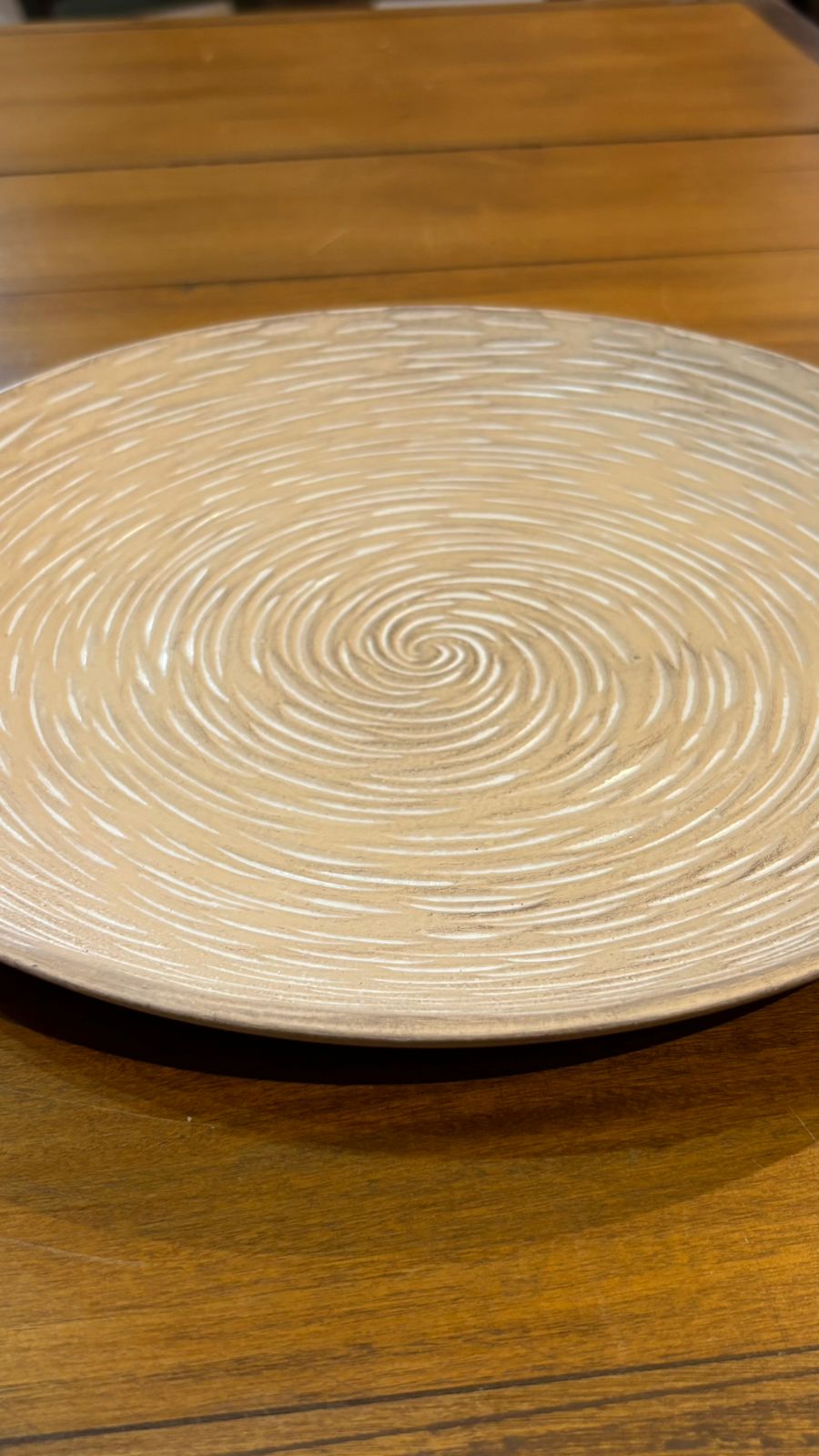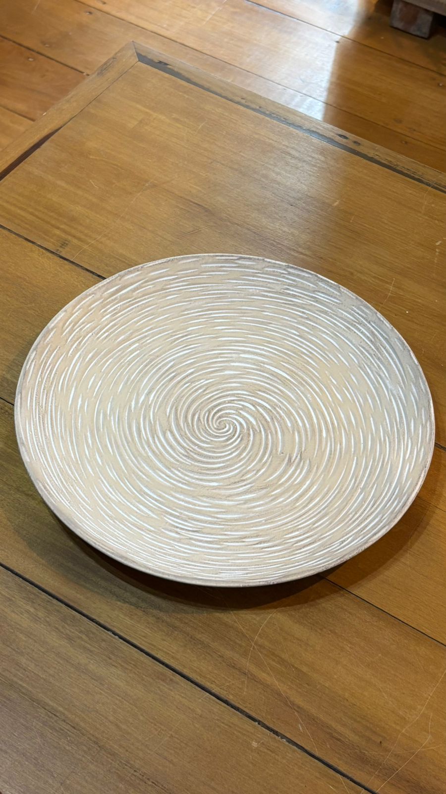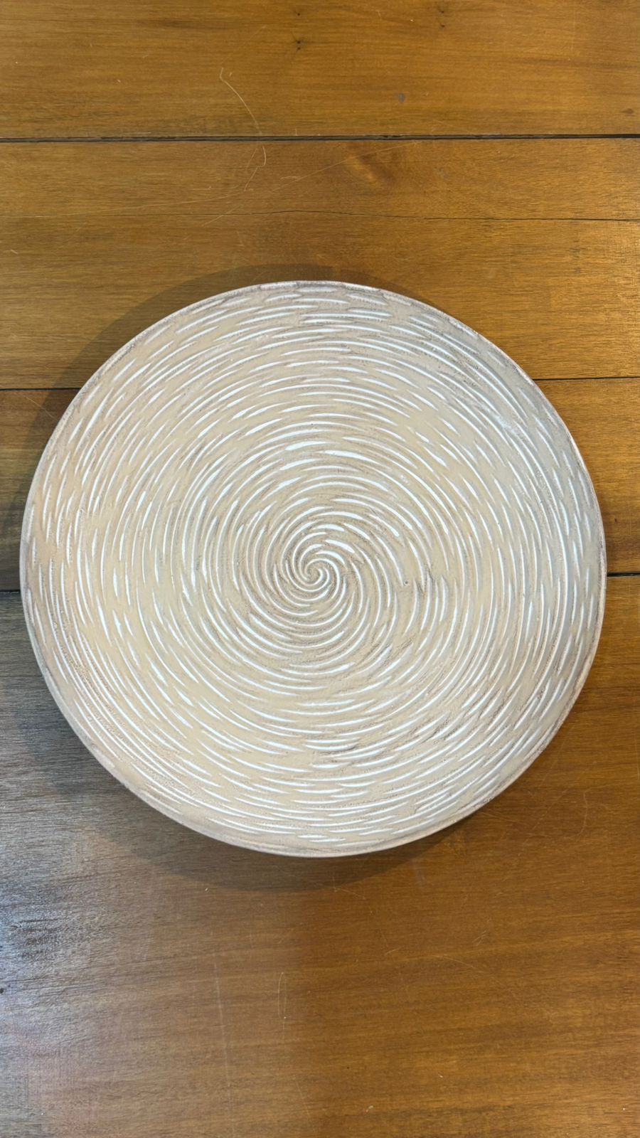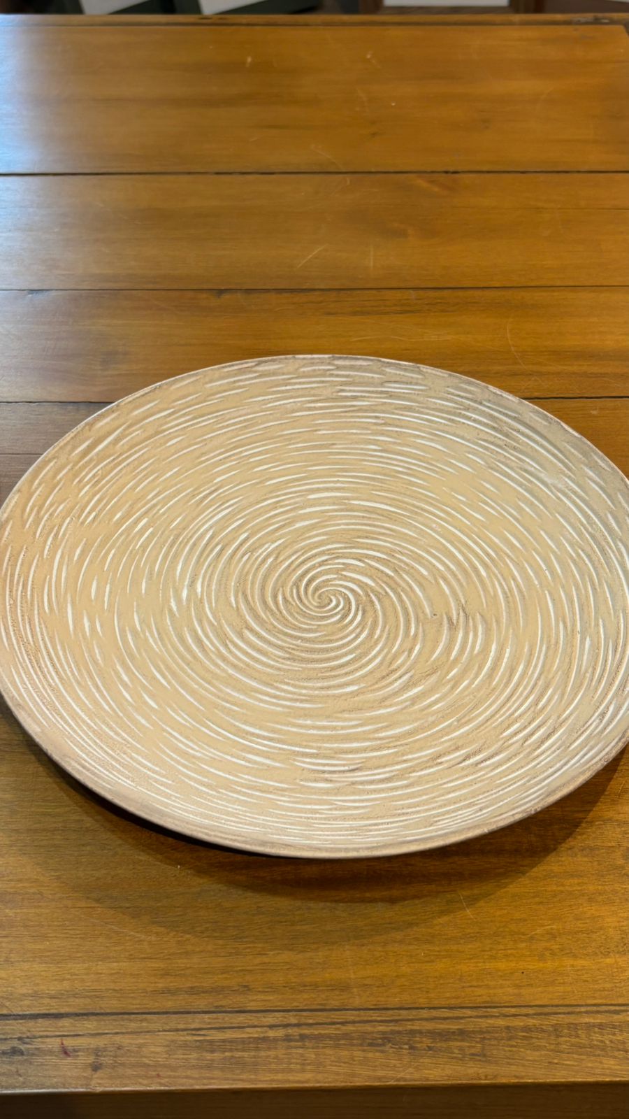 Produzido em madeira, este centro de mesa possui formato redondo e acabamento com textura em espiral, trazendo movimento, sofisticação e um toque artesanal à decoração.