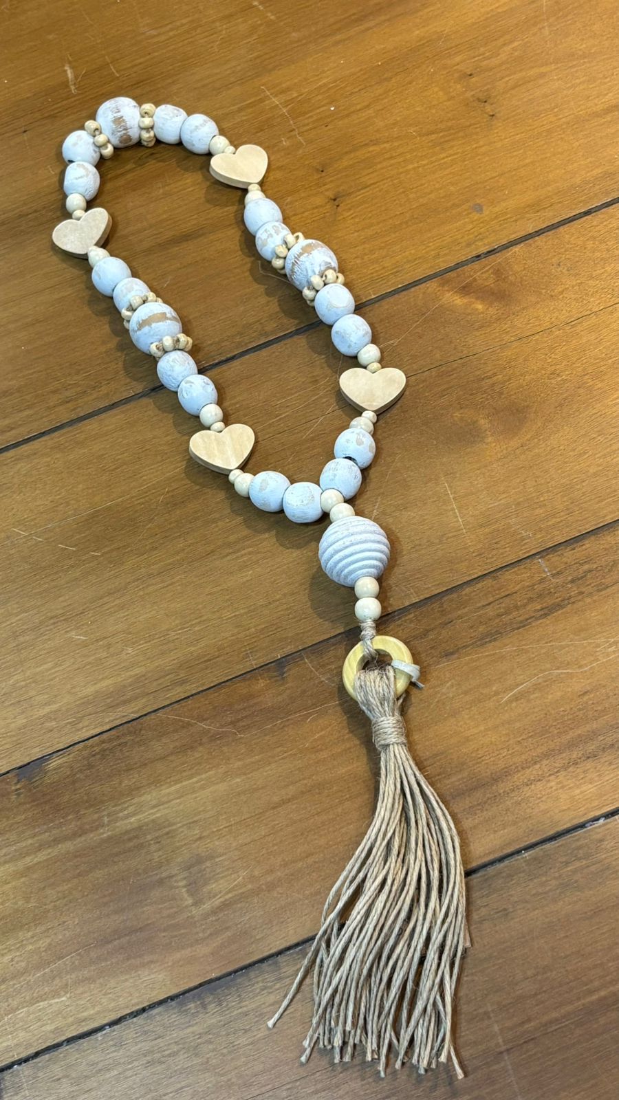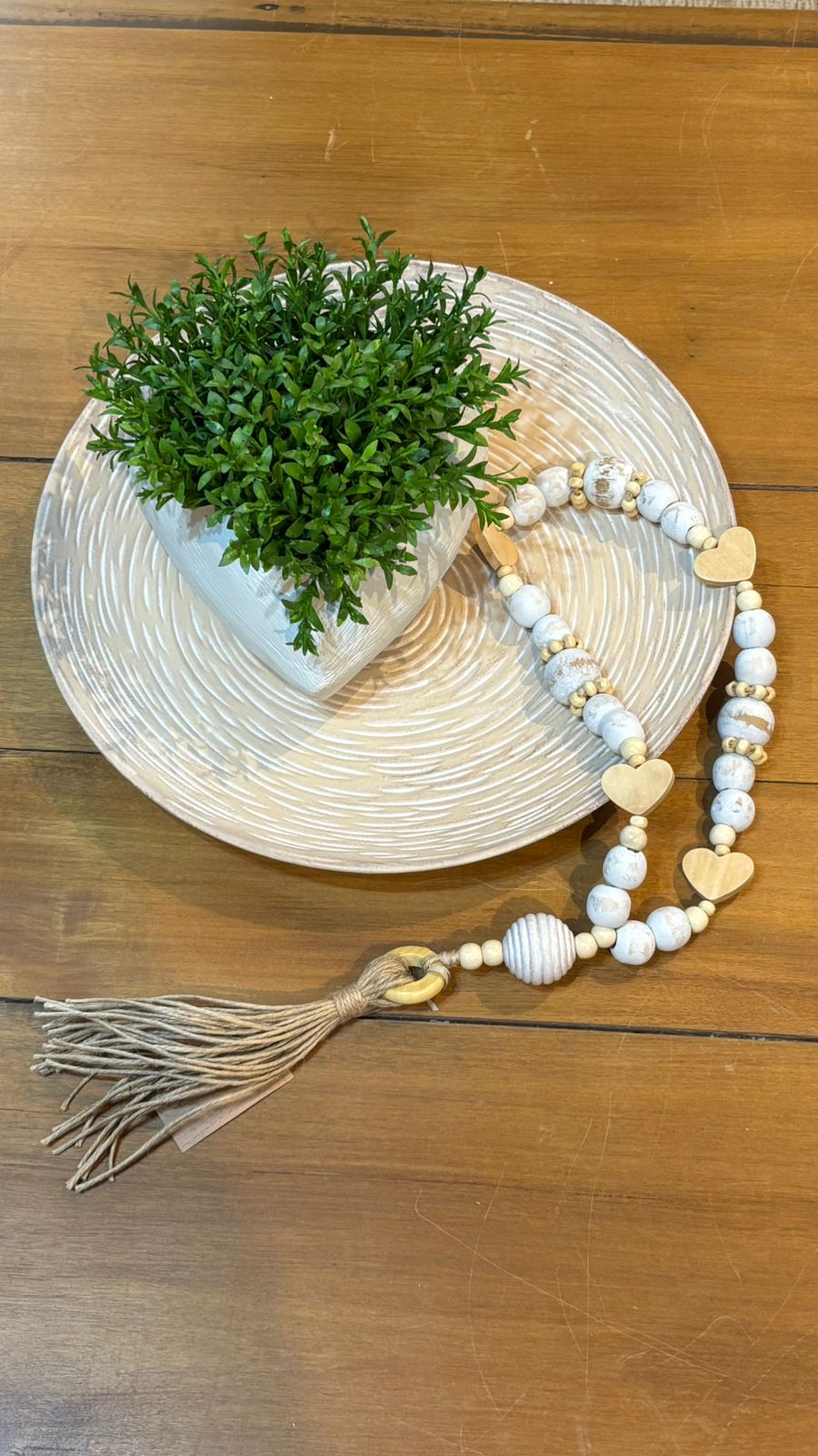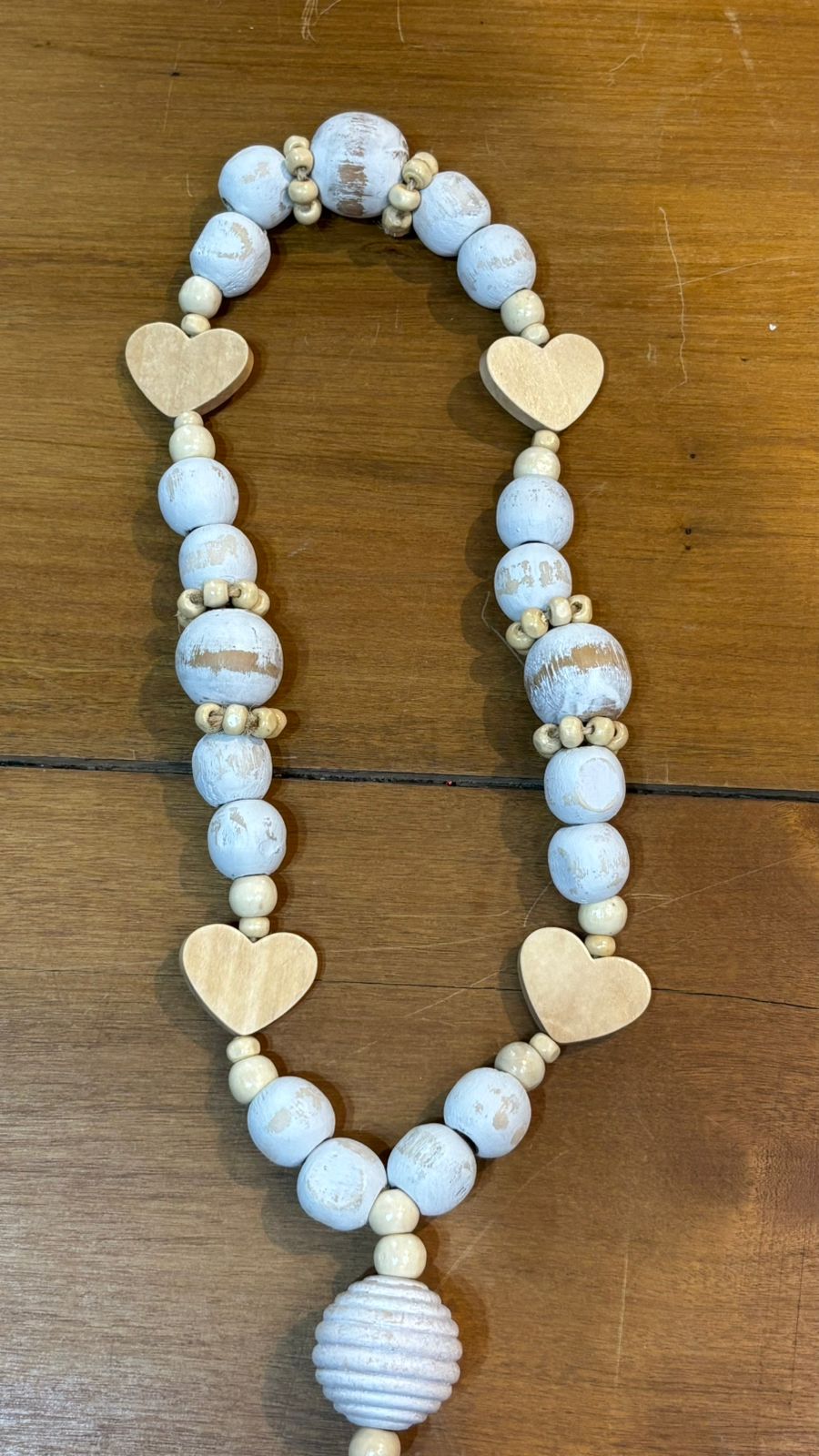 Este enfeite pendente é composto por contas em madeira em tons suaves, delicados corações em madeira, acabamento artesanal e um elegante tassel em fios naturais, criando uma peça leve, afetiva e cheia de charme.
