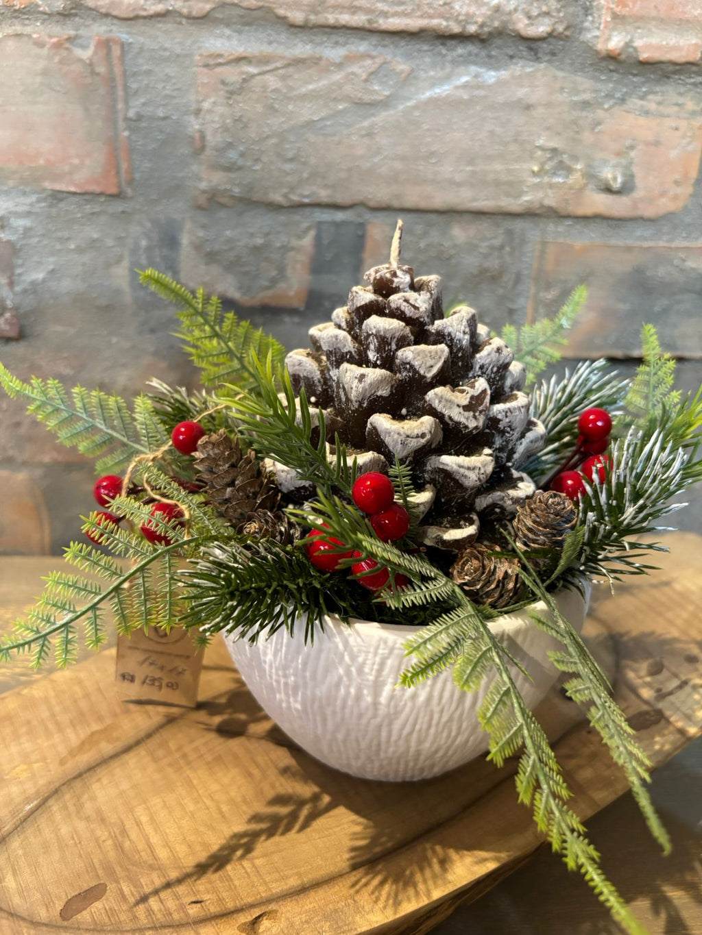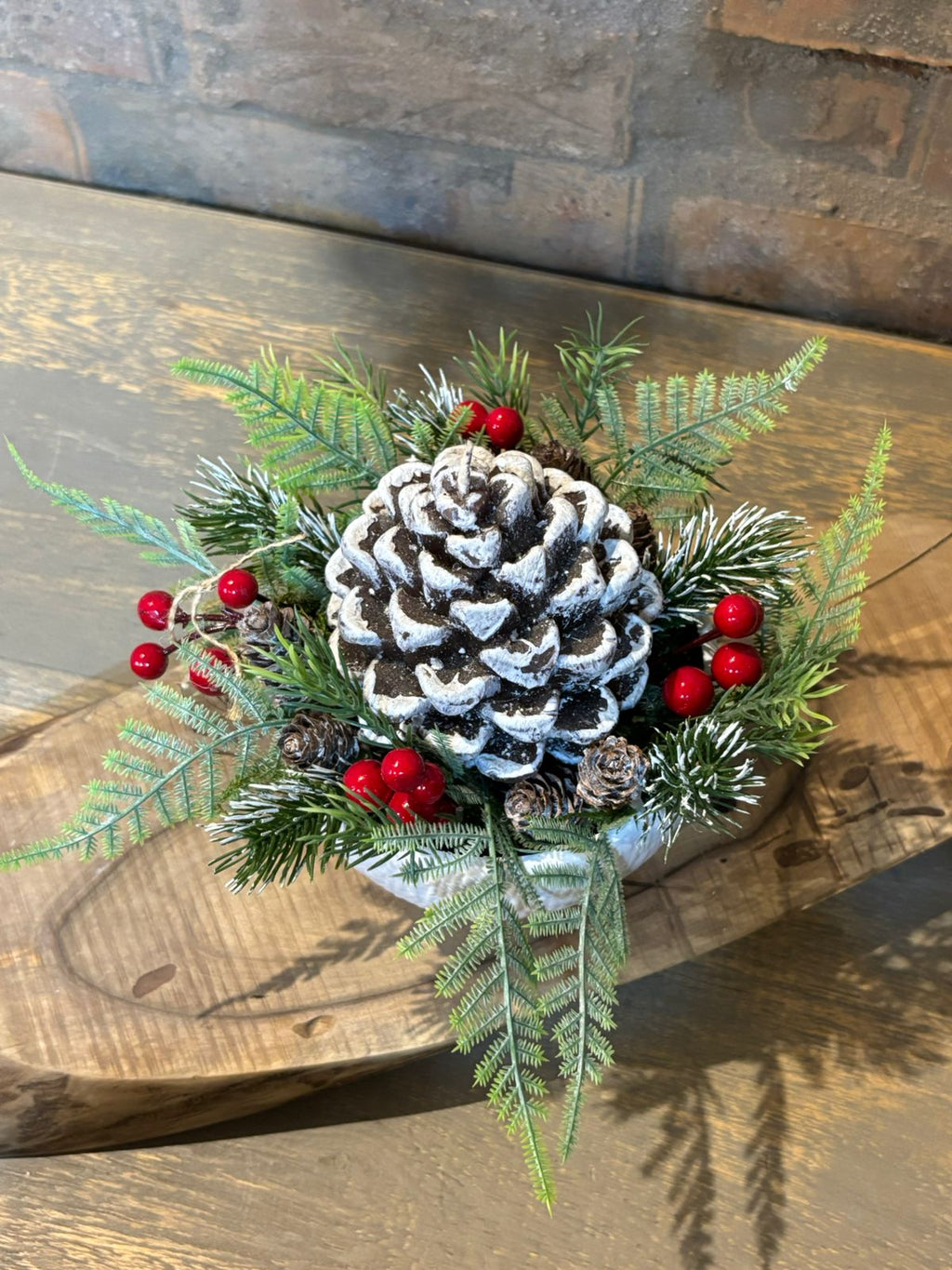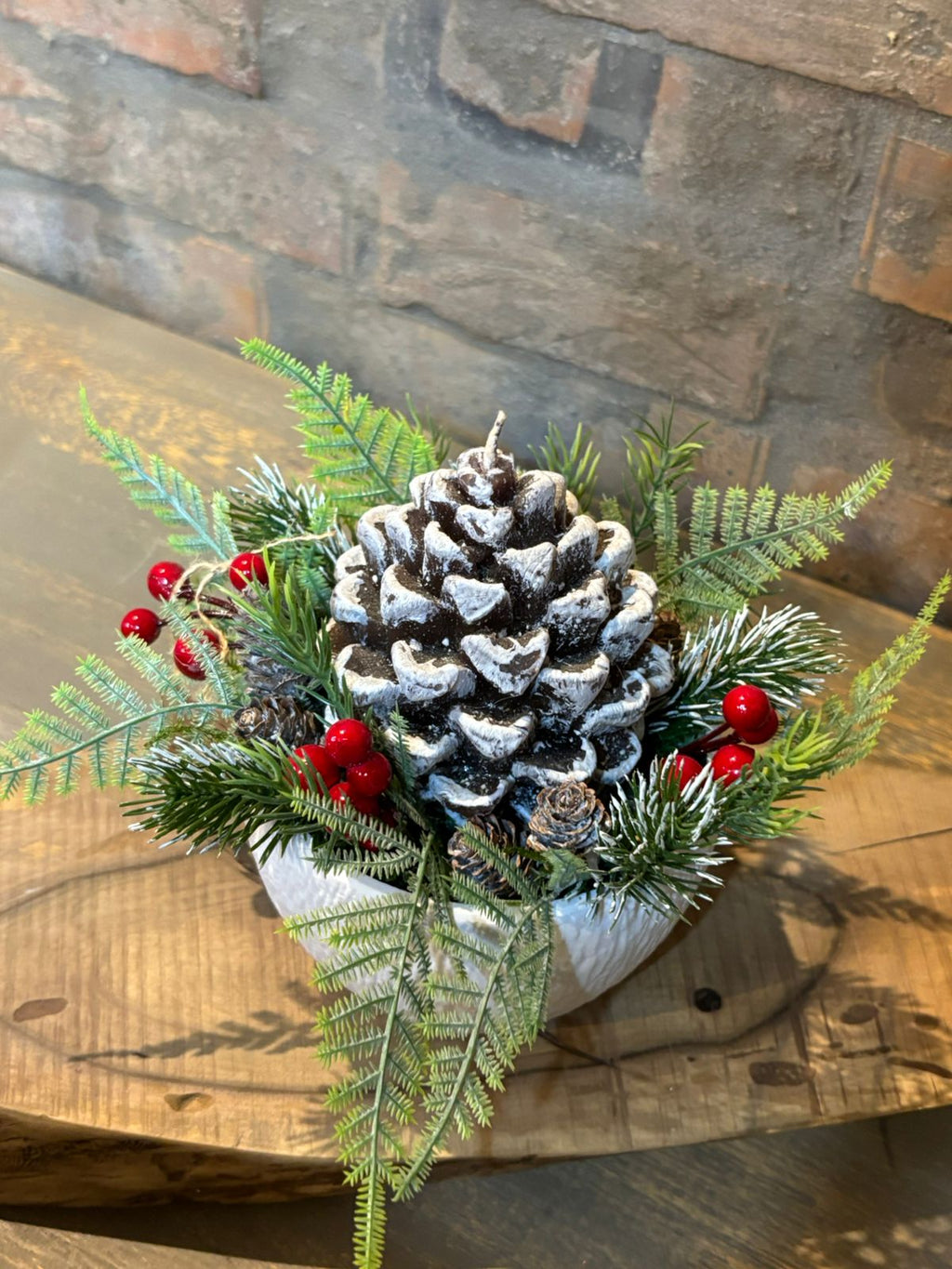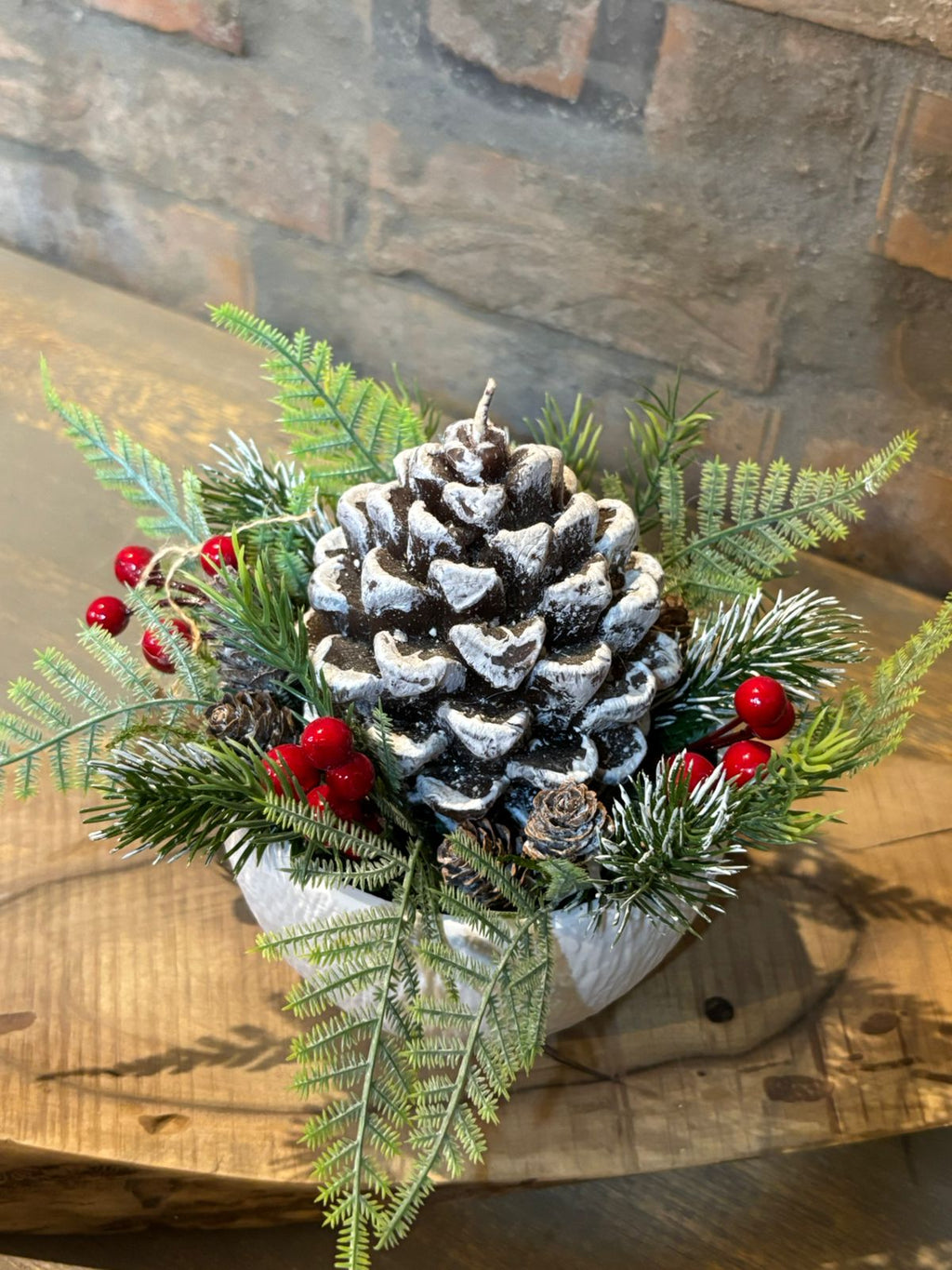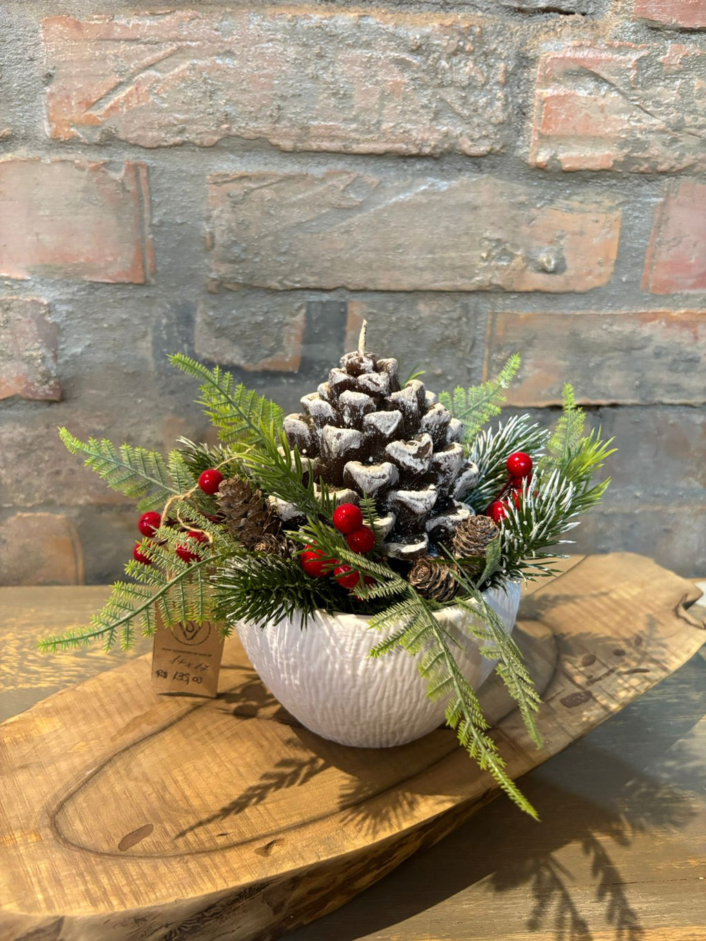 Este vaso branco de melamina apresenta uma decoração sofisticada com galhos e berries permanentes, trazendo um toque natural e elegante à sua decoração natalina. No centro, uma vela em formato de pinha adiciona charme e aconchego, criando um ambiente acolhedor para as festas de fim de ano. Ideal para quem busca um arranjo duradouro e de qualidade.