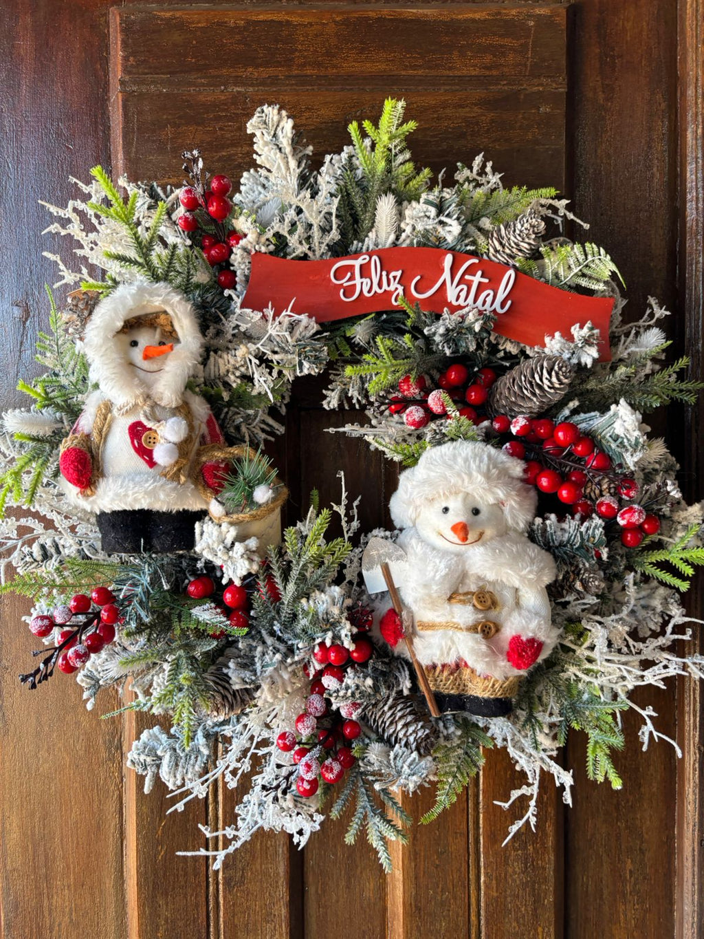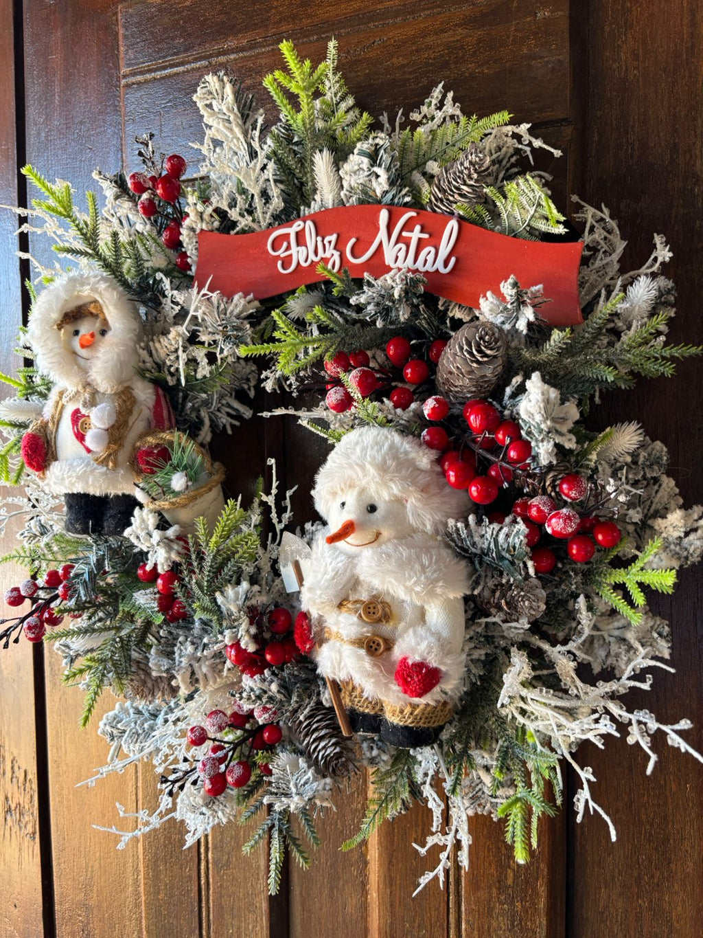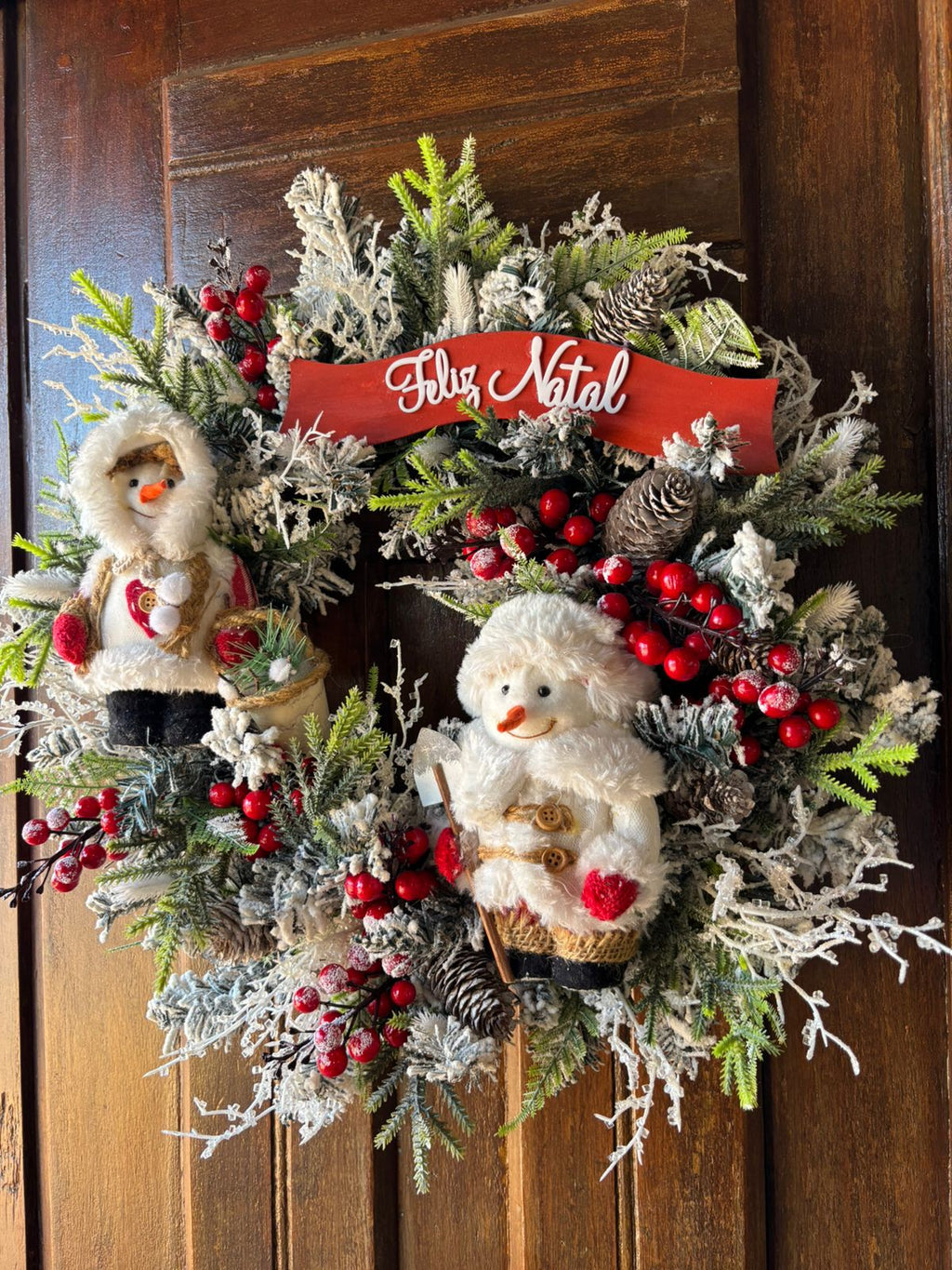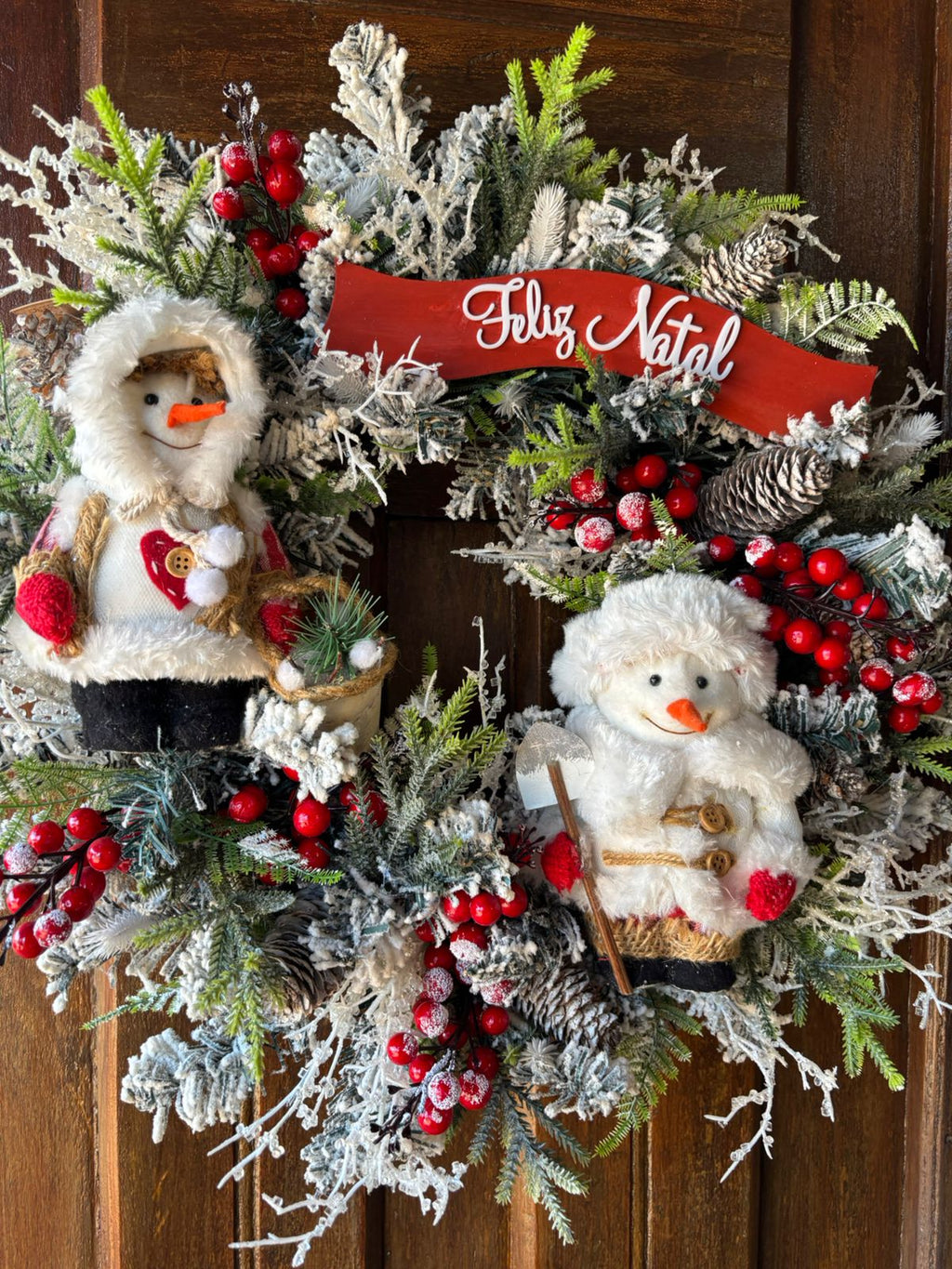 Esta guirlanda de Natal combina verdes natalinos, pinhas e berries, criando um visual clássico e acolhedor para sua decoração. Dois bonecos de neve adicionam um toque lúdico, enquanto a placa "Feliz Natal!" celebra o espírito festivo, tornando-a perfeita para enfeitar portas, paredes ou janelas com elegância e tradição.